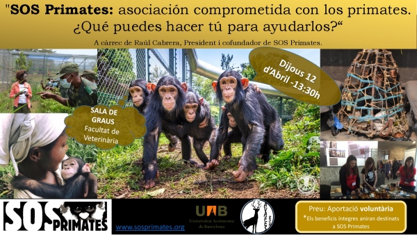 El jueves 12 de abril estaremos en la Facultad de Veterinaria de la Universitat Autònoma de Barcelona, con una conferencia gratuita sobre SOS Primates, a cargo de Raúl Cabrera Porcel, Presidente de la asociación.