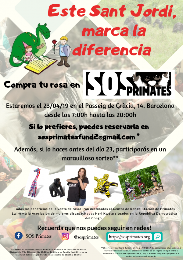El fin de semana del 13 y 14 de abril estaremos presentes en las Jornadas de Primatología de la Universidad UCH-CEU (Univ. Cardenal próximo martes 23 de abril (Sant Jordi) estaremos en un stand en Paseo de Gracia 14, Barcelona vendiendo rosas para conseguir donativos para el CRPL, Lwiro Primates. Además, si la encargas con antelación (siguiendo las instrucciones del cartel) podrás participar en el sorteo de una camiseta o una artesanía del centro de mujeres discapacitadas de de Heri Kwetu, en RDCongo.