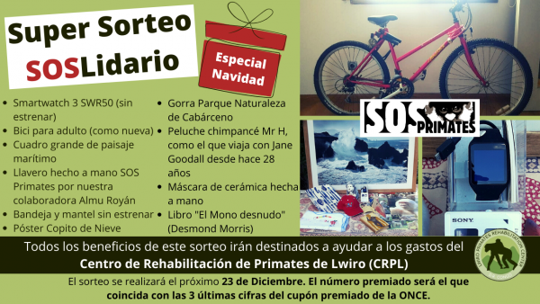 Muchas gracias y suerte a todos. Os informaremos del ganador/a y aprovechamos para presentaros el próximo sorteo que se trata de un ESPECIAL NAVIDAD con premios increíbles. Ya podéis solicitar vuestro número (máximo 10 números por persona en este caso). Información y pedidos en info@sosprimates.org