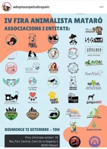 El domingo 12 de septiembre estaremos en la 4º edición de la Feria Animalista organizado por @SOS Animals Maresme y el Consistorio de Mataró desde las 10 horas, en el Nou Parc Central (Camí de la Geranta 6, 08303 Mataró.