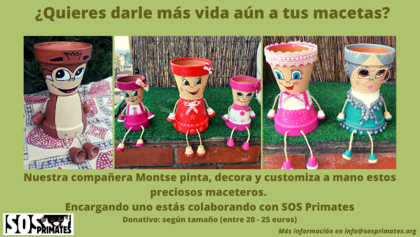 Hoy mostramos el trabajo de Montse, una colaboradora muy solidaria que pinta a mano estos maceteros y los detalla y personaliza al máximo. Podéis pedir el vuestro por un donativo de entre 20 y 25 euros, dependiendo del tamaño. Estaréis ayudando a SOS Primates para que pueda colaborar en los gastos de alimentación de los primates huérfanos del CRPL, Lwiro Primates.