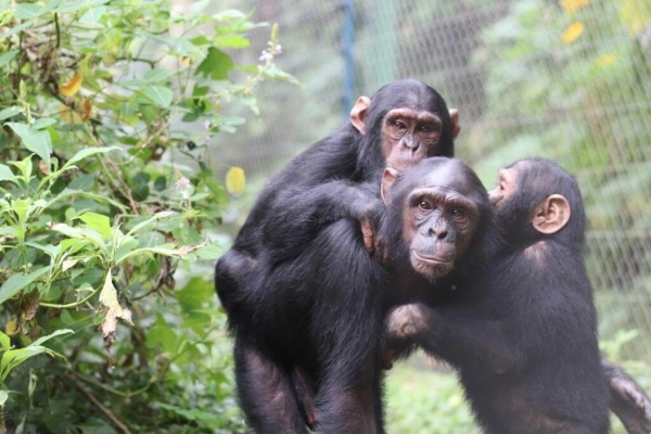 Se ha convertido en una estupenda protectora para las crías nuevas que van siendo integradas a su grupo. En la foto la podéis ver cargando a “Aziza” y recibiendo mimos de “Ujasiri”.