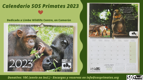 Lo hemos preparado con mucho cariño, y esperamos que os guste. Este año también es bilingüe (español-inglés o español-francés), para así poder aumentar el rango de distribución a todo el mundo y que nuestra ayuda tenga un mayor impacto. Gracias a quienes lo hacen posible, tanto de nuestro equipo de SOS Primates (Almu, María, Aurora, Raúl, Kristina, Lucía, Karina y especialmente a su diseñadora, S. Nowak) como del equipo de LWC.