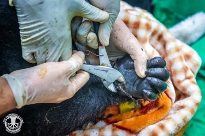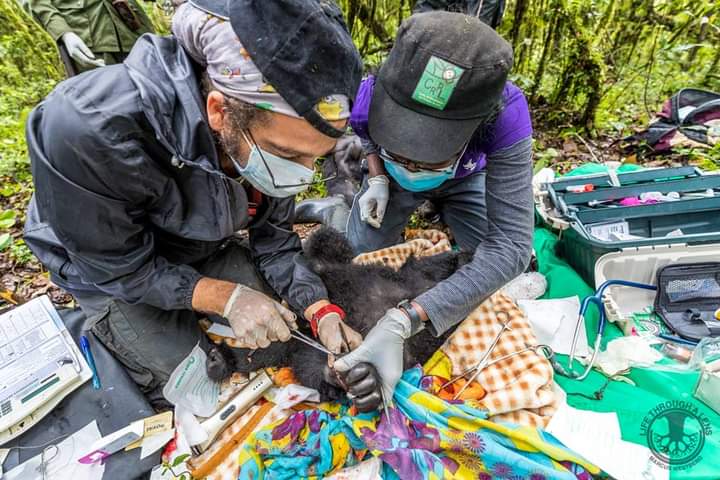En las imá­ge­nes podéis ver a los Gori­lla Doc­tors actuan­do en la extrac­ción de una tram­pa (alam­bre) en la muñe­ca de una cría de gori­la, que le ha cau­sa­do lesio­nes que nece­si­tan de una inter­ven­ción. Entre los pro­fe­sio­na­les de dicha orga­ni­za­ción, está el res­pon­sa­ble de vete­ri­na­ria del CRPL, Luis Flores.