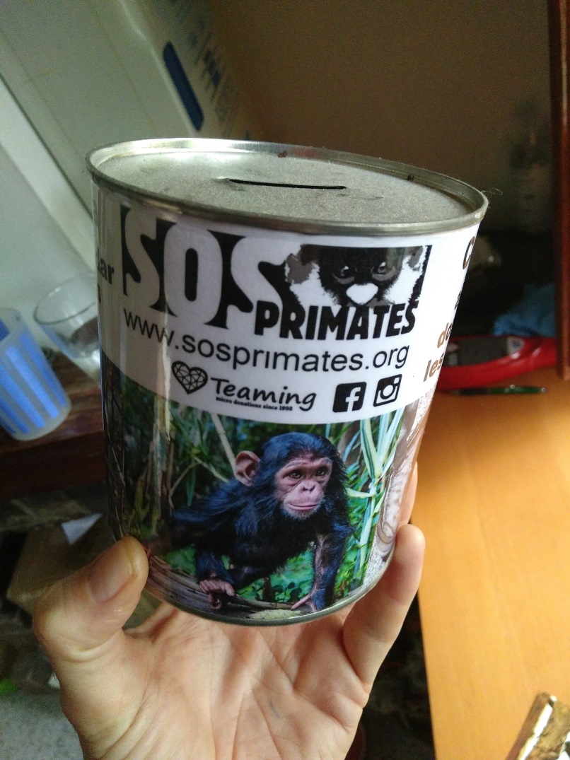 Si quie­res ayu­dar a los pri­ma­tes huér­fa­nos del CRPL, Lwi­ro Pri­ma­tes, en la RDCon­go, como Kin­du, en la foto, pre­gun­ta a tu clí­ni­ca vete­ri­na­ria u otro esta­ble­ci­mien­to de con­fian­za si nos deja poner una hucha de SOS Pri­ma­tes en su recepción.