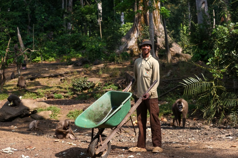 En la foto, un cuidador del Drill Ranch, un centro de recuperación de driles que gestiona la ONG Pandrillus, en sus tareas de limpieza de la instalación de los driles.