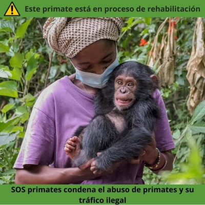 Photos: Caretaker Mireille holding ‘Banalia’ in its recovery process in the CRPL, Lwiro Primates, and two of our volunteers, Aurora and Nuria, in one of the fairs that we organize to gather donations for SOS Primates.