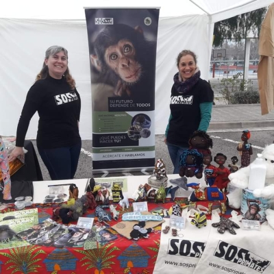 Photos: la soigneuse Mireille avec “Banalia” dans son processus de réhabilitation au CRPL, Lwiro Primates, et deux de nos bénévoles, Aurora et Nuria à l’une des foires avec lesquelles nous recevons des dons pour SOS Primates.