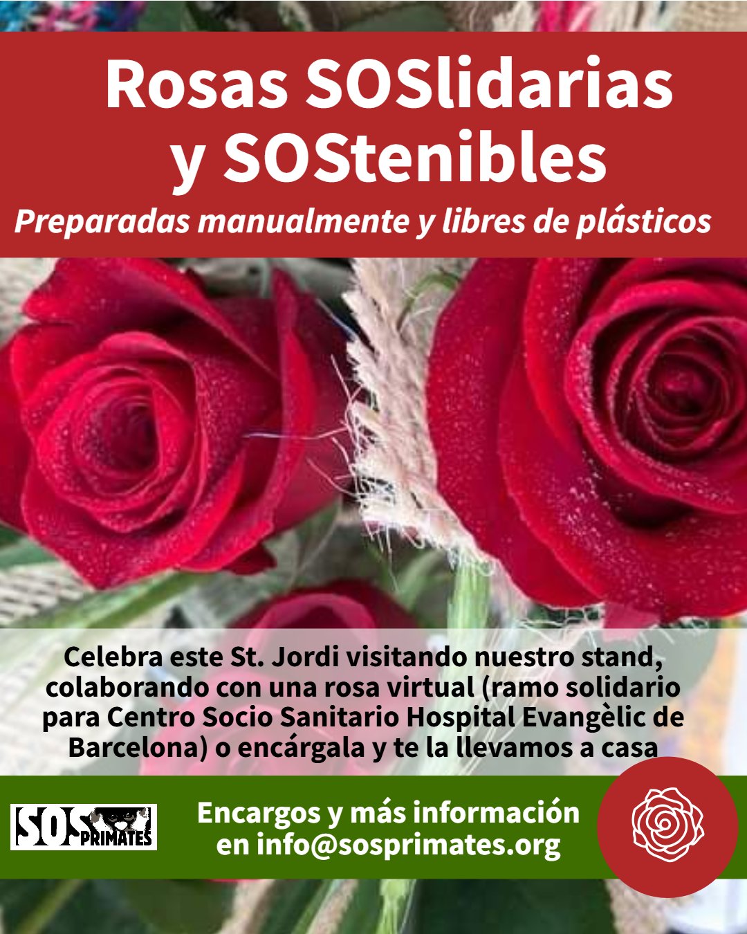 Comme chaque année, nous tiendrons un stand sur le Paseo del Born, à Barcelone, et vous pourrez commander votre rose soslidaire sans plastique, assemblée à la main par notre équipe de bénévoles. Vous pourrez également commander une rose pour composer un bouquet destiné aux personnes âgées du Centre Socio-Sanitaire de l’Hôpital Évangélique de Barcelone.